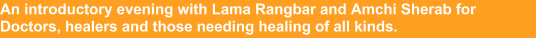 In this same session, the oral transmission of the practice of Orgyen Menla will be offered by Lama Rangbar along with a short group meditation practice on Orgyen Menla. By practicing on the archetype of Orgyen Menla, one can achieve both ordinary and supreme accomplishments and gain the capacity to enact Buddha activities of healing for benefiting all sentient beings. This practice is especially designed for Doctors and Healers who wish to increase both their diagnostic and treatment capacities In order to benefit others, as well as patients who wish to profoundly expedite their own self-healing process.